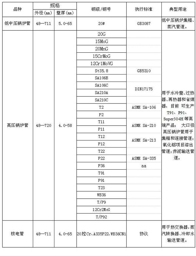 執(zhí)行GB3087、GB5310、DIN17175、ASME SA-106、ASME SA -210M、ASME SA -213M、ASME SA -335M等相關(guān)標(biāo)準(zhǔn)。用于高壓鍋爐(工作壓力一般在9.8Mpa以上,工作溫度在450℃~650℃之間)的受熱面管子、省煤器、過熱器、再熱器、石化 工業(yè)用管等。